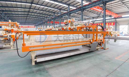 高效节能压滤机是在自动拉板压滤机基础上增加更换了机械手,加长了油缸,增加了区间,一次拉开多块滤板卸料。